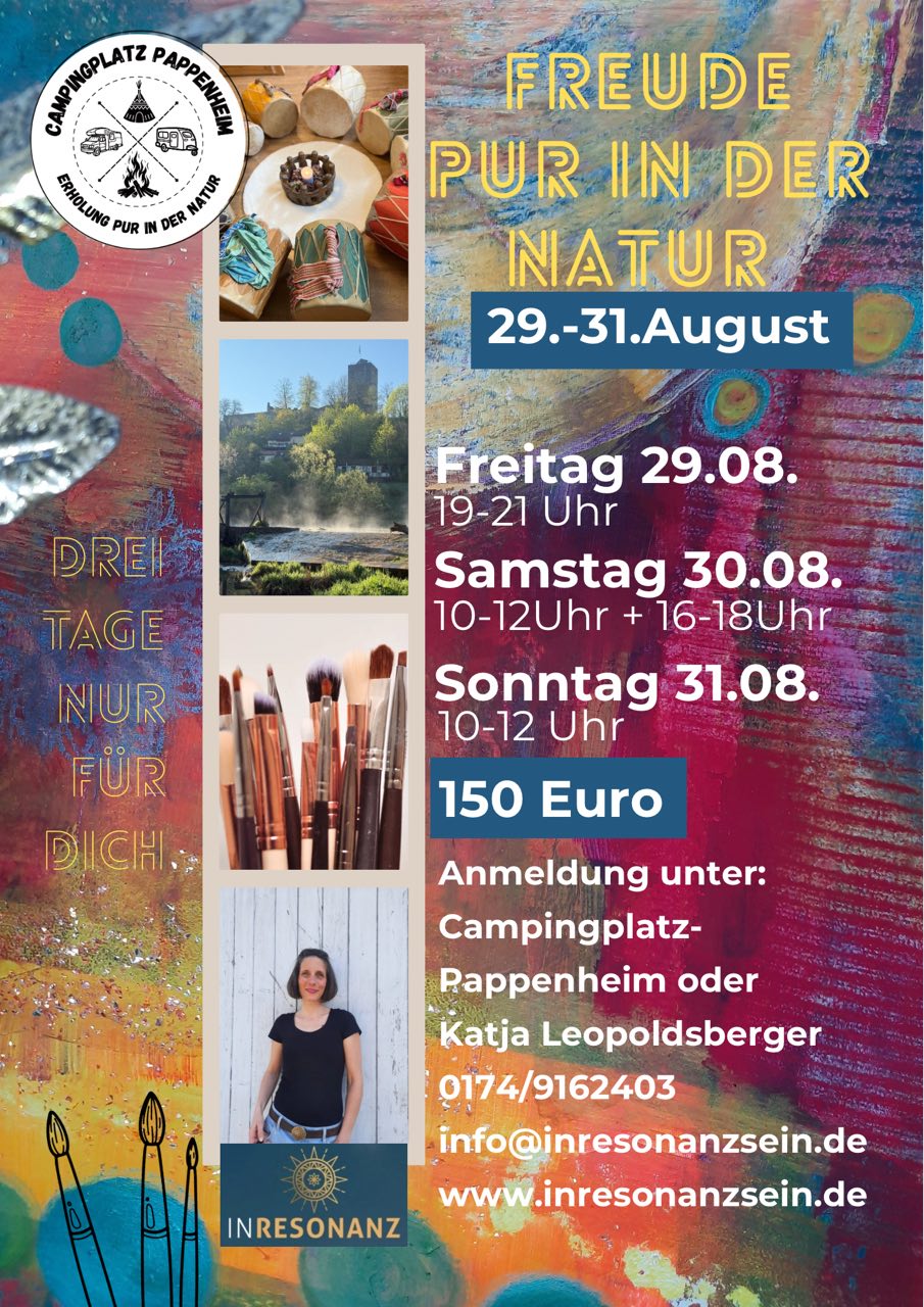 Freude pur in der Natur auf dem Campingplatz Pappenheim. Drei kreativ, inspirierte Tage für DICH. Wir werden gemeinsam in einer kleinen Gruppe von 10 Personen zusammenkommen. Herztrommeln, schöne Kreistänze und kreative „Malzeit“ auf Deiner Leinwand erwarten Dich. Übernachtung im Tipi möglich.